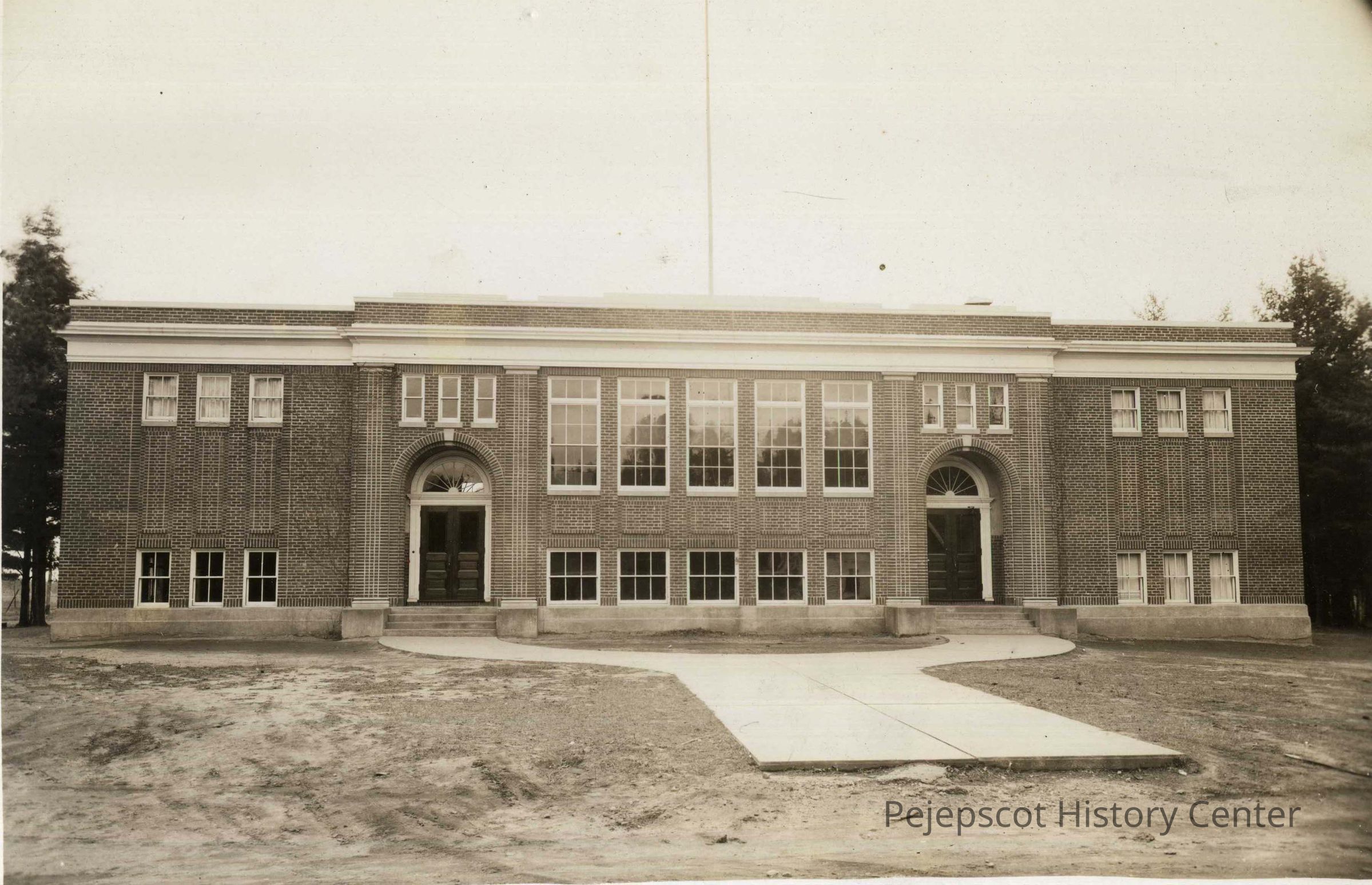 A B/W photograph of the newly completed Longfellow School on Longfellow Avenue.