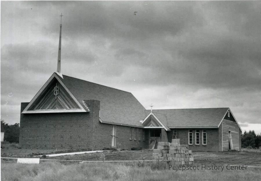 A B/W photograph of the Lutheran Church being constructed on Upper Maine St.