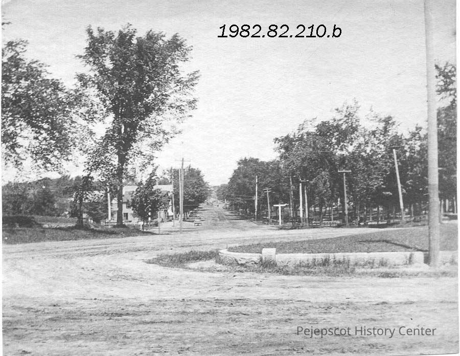 A B/W photograph of the Mall & Maine Street as seen from in front of the First Parish Church.