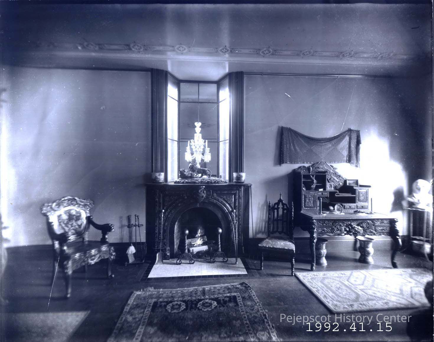 A B/W photograph of the north wall and fireplace in the Chamberlain Parlor.