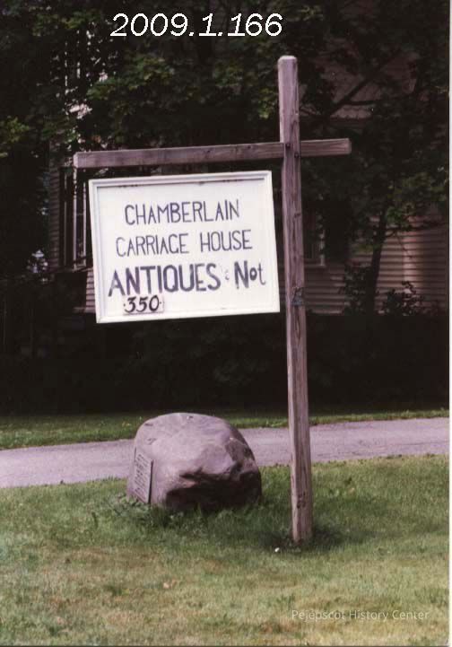 A color photograph of the sign for an antique store which is located in Chamberlain's birth home.