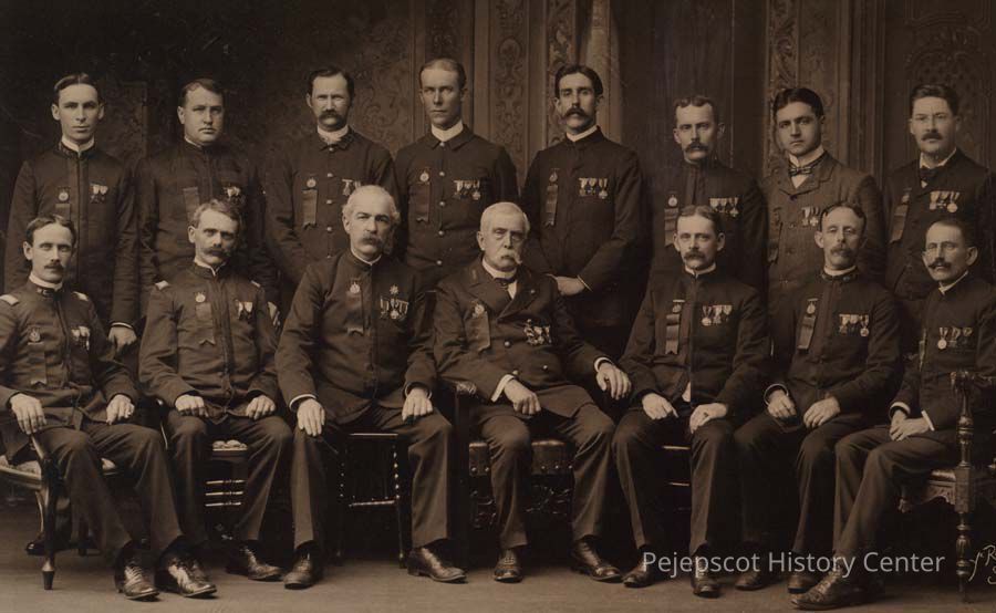 A B/W photograph of the Sons of Union Veterans. In the first row sitting on the far right is Elmore Nathaniel Courson of Brunswick, Maine.