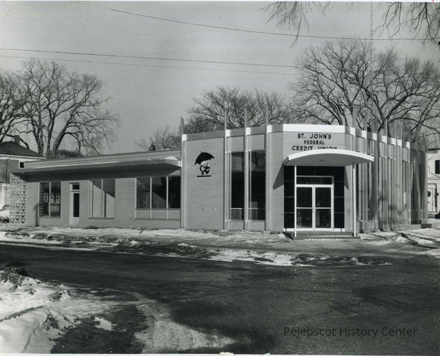 A B/W photo of the St. John's Federal Credit Union on the corner of Cushing and Pleasant Streets.
