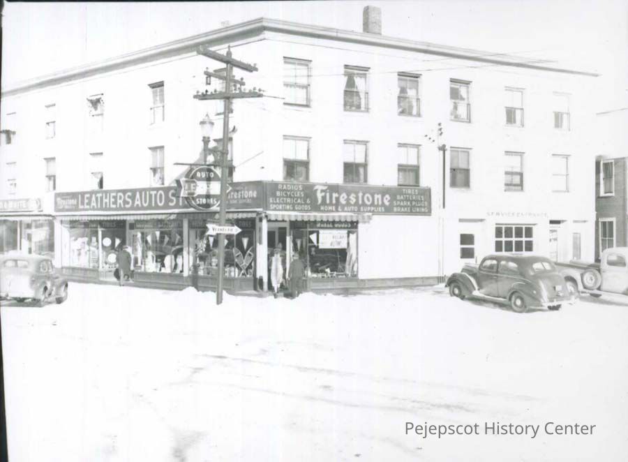 A B/W photograph of the St. Onge Block at the corner of Maine and Mason Street..