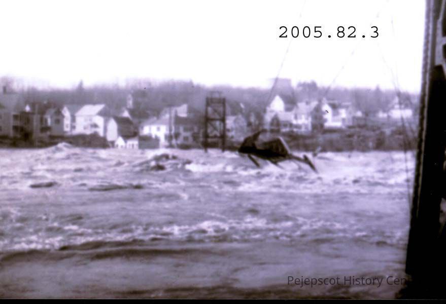 A photo of the Swinging Bridge across the Androscoggin River during the 1936 flood.
