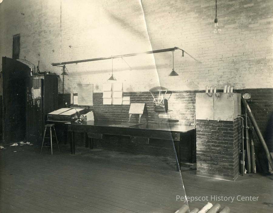 A B/W photograph of the testing room at the Pejepscot Paper Co. mill in Topsham.