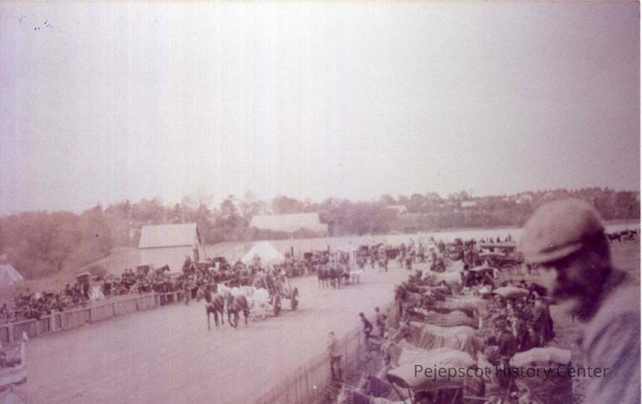 A B/W photograph of the Topsham Fair race track with all the parked carriages and horses..