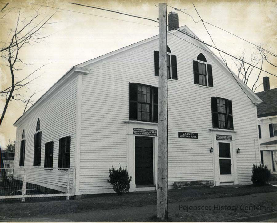 A B/W photograph of the Varney Lecture Hall on School Street. It was formerly a 2nd Baptist Church, then a Sunday School for the Congregational church, home of the Pejepscot Historical Society, and later home of a local theater group.