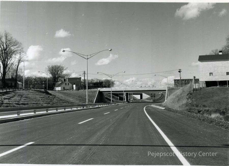 A B/W photograph of the Water Street overpass as seen from the Route 1 bypass.
