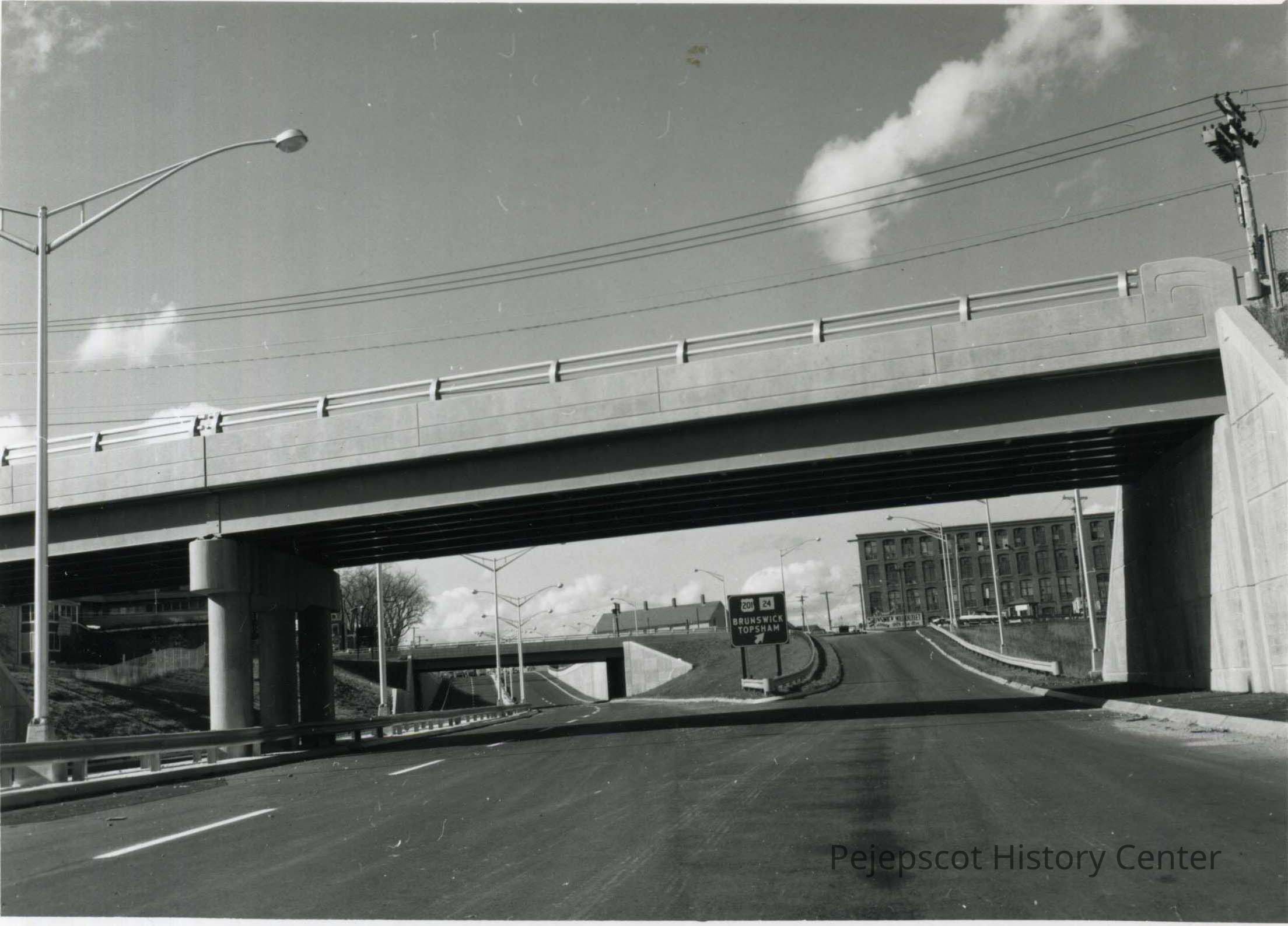 A B/W photograph of the Water Street overpass, looking from Route 1.