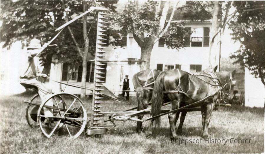 A photo of Thomas Edwin Skolfield's North Harpswell farm. There is a team of horses hooked to a mowing machine in the foreground. 7/1918.