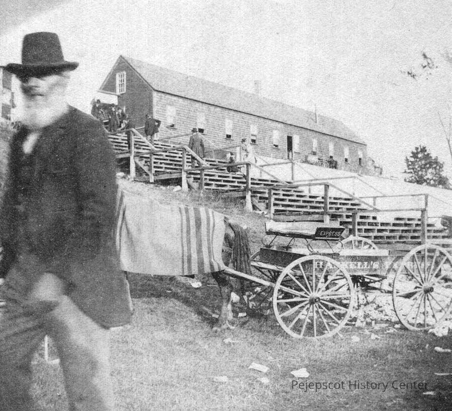 A B/W photograph of Topsham Fair grounds showing the stairs that lead up the hill.