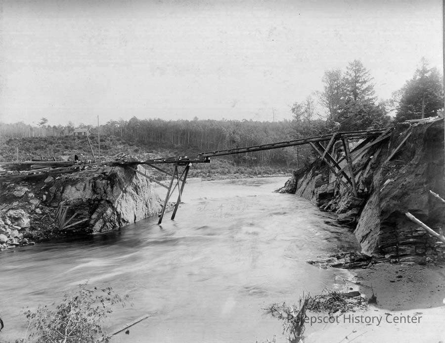 A photo of tracks across the Androscoggin River at Pejepscot during construction of the dam. Pejepscot paper Co. Oct 6, 1894