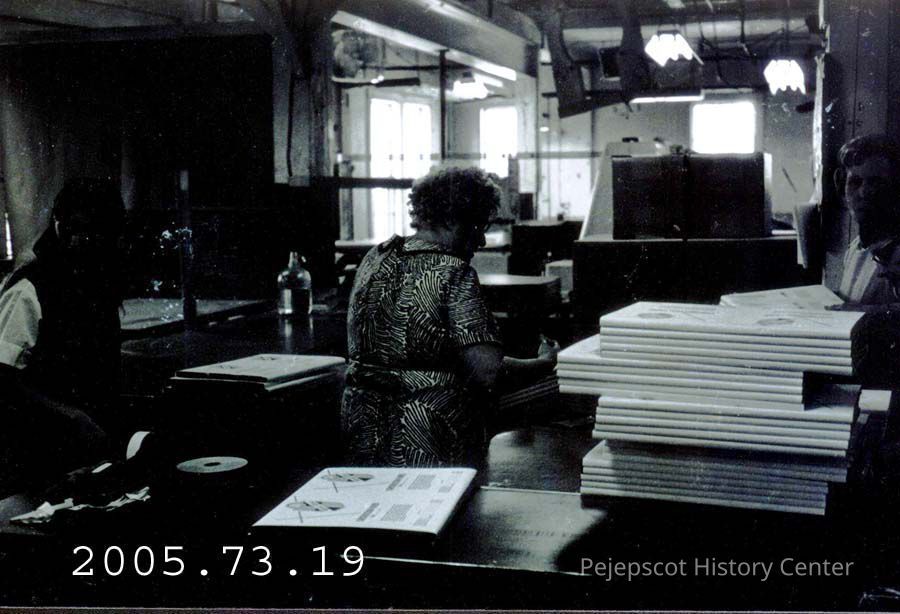 A B/W photo of unidentified mill workers. The man cannot be seen clearly. The woman is packaging something.