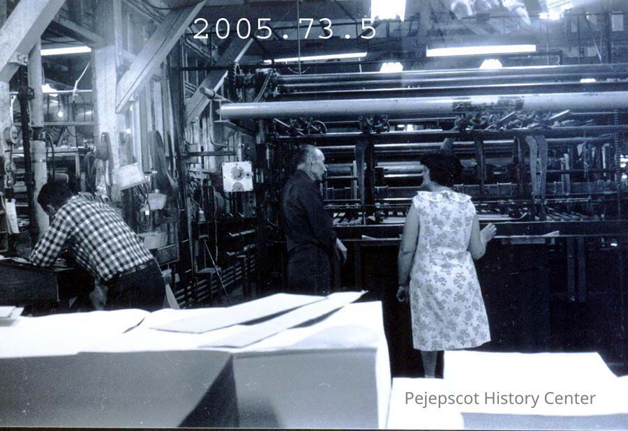 A B/W photo of three unidentified workers, working at the Bowdoin mill, Pejepscot Paper Co., Topsham, Maine.