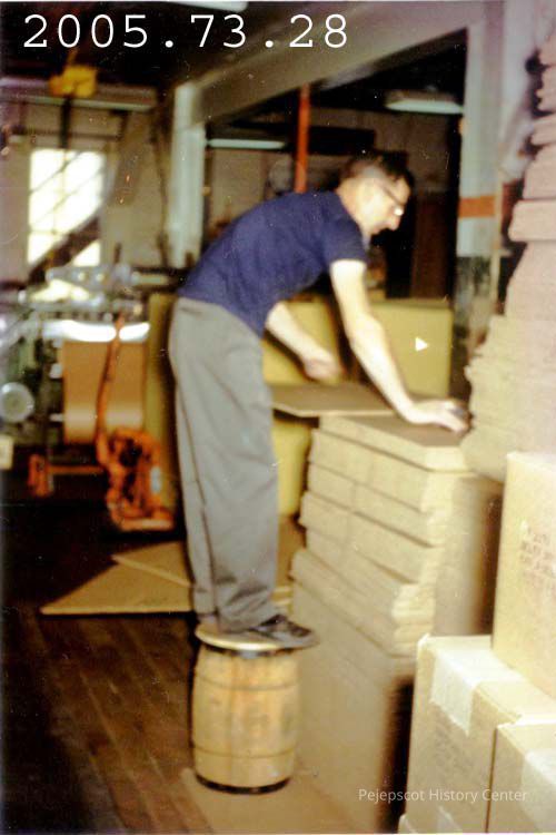 A color photo of unidentified man working at the Bowdoin Mill. He is standing on top of a small wooden barrel. Looks very unsafe. This photo is marked Feb 1970.