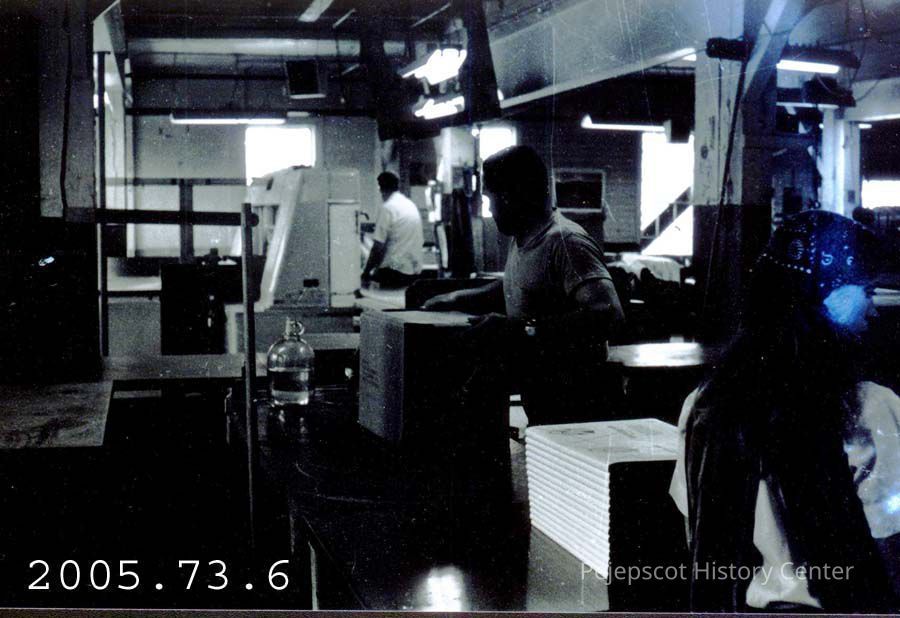 A B/W photo of several unidentified mill workers, working at the Bowdoin mill, Pejepscot Paper Co., Topsham, Maine.