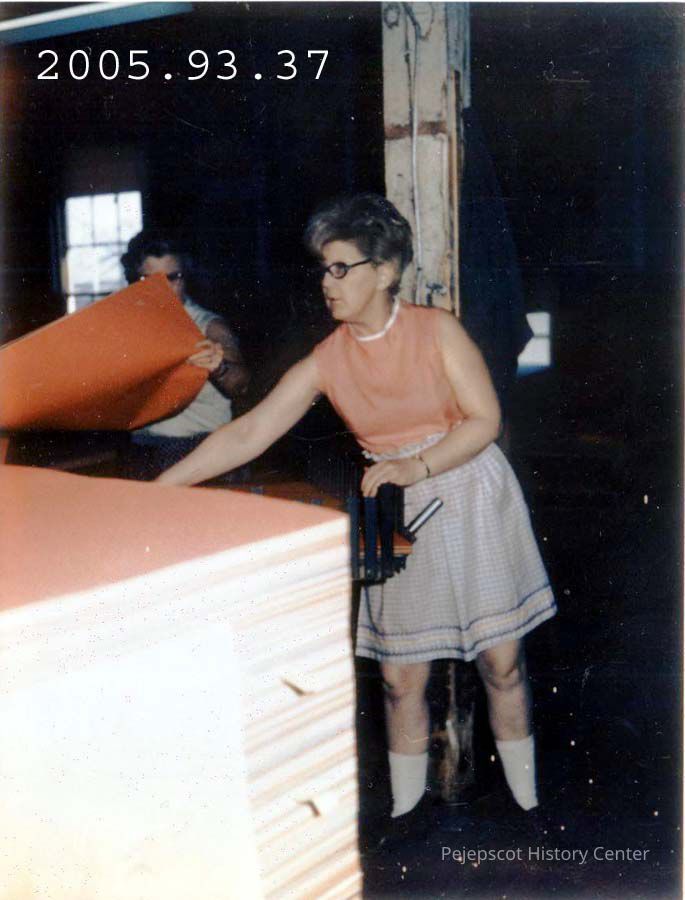 A color photo of unidentified women workers at the Bowdoin Mill. The are behind some large sheets of paper.