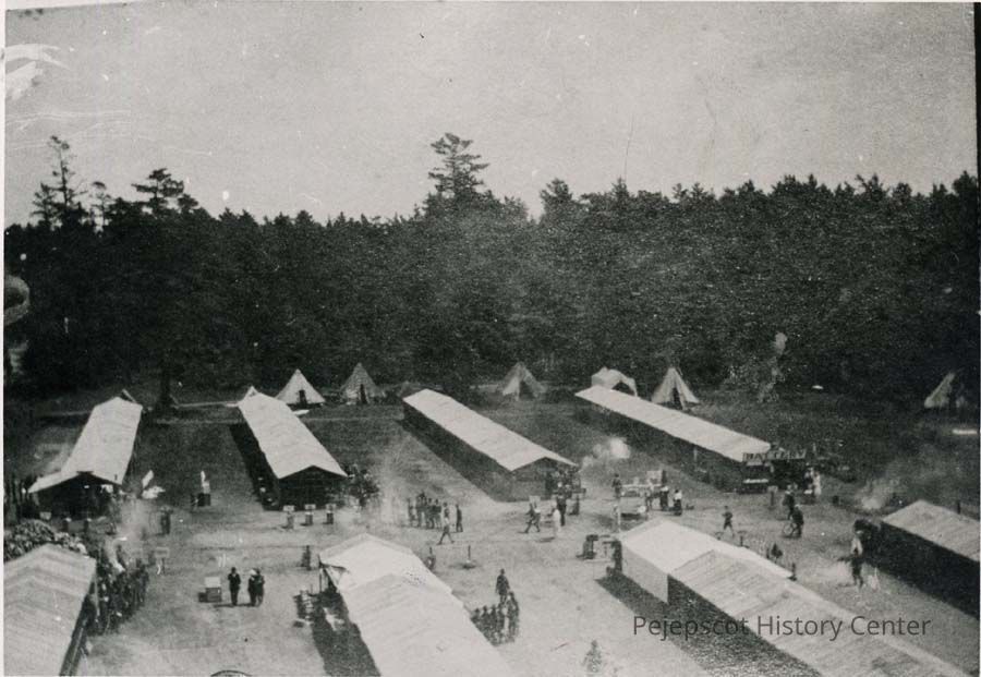 A B/W photograph of World War I soldiers on the Delta at Bowdoin College. This is where they had their meals..