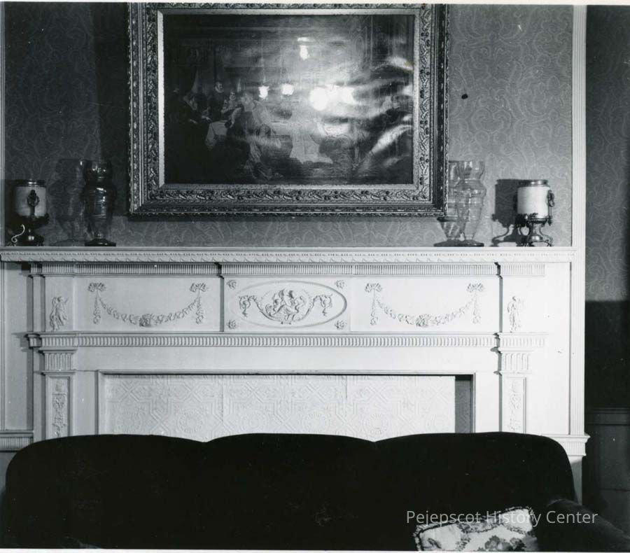 A B/W photograph showing a close up of the fire place and mantle, Porter House, 26 Elm Street, Topsham..Collection