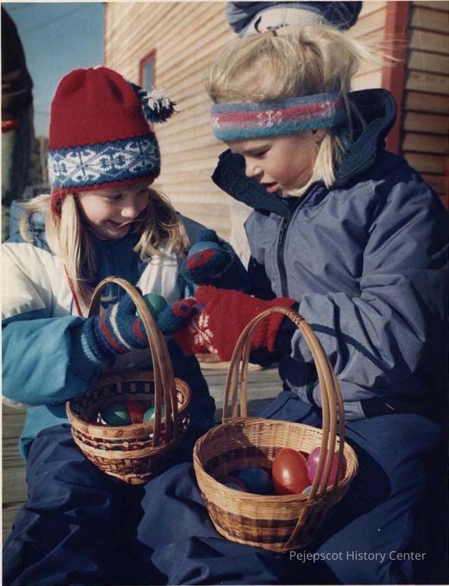 A color photographic view of (l to r) Sandy Beaulieu, age 7 from Topsham and Ellen Grimnes, age 7 from Brunswick. They are cousins.