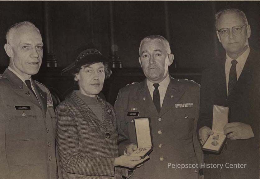 A B/W photographic view of 1st Lt. Robert W. Boyd. I believe he is the man on the right who is holding a purple heart. The woman is accepting the "silver star". Marked on the back "Silver Star".
