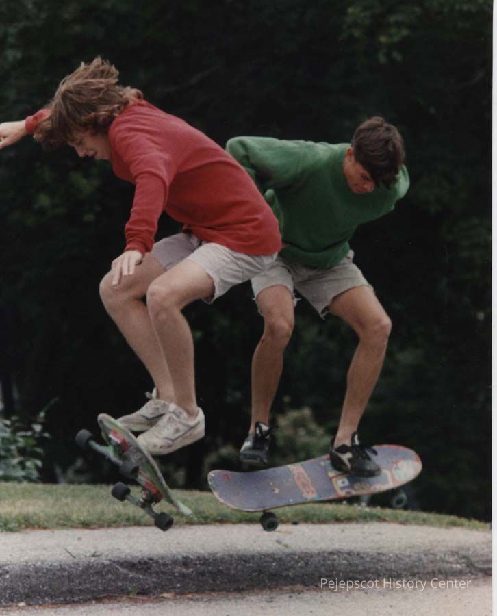 A color photographic view of 2 children skate boarding. This photo was published 7/7/1989.