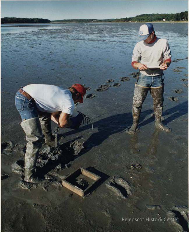 A photo view of 2 clam diggers at Harpswell. 9/16/1991.