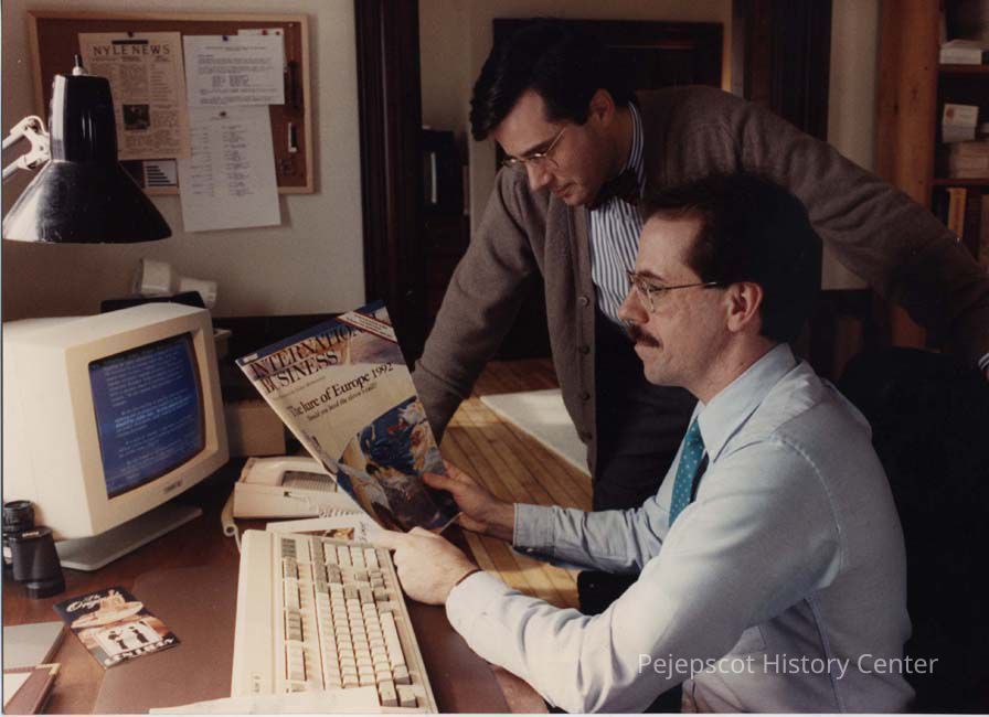 A photo view of 2 men looking at a magazine. 2/26/1990.