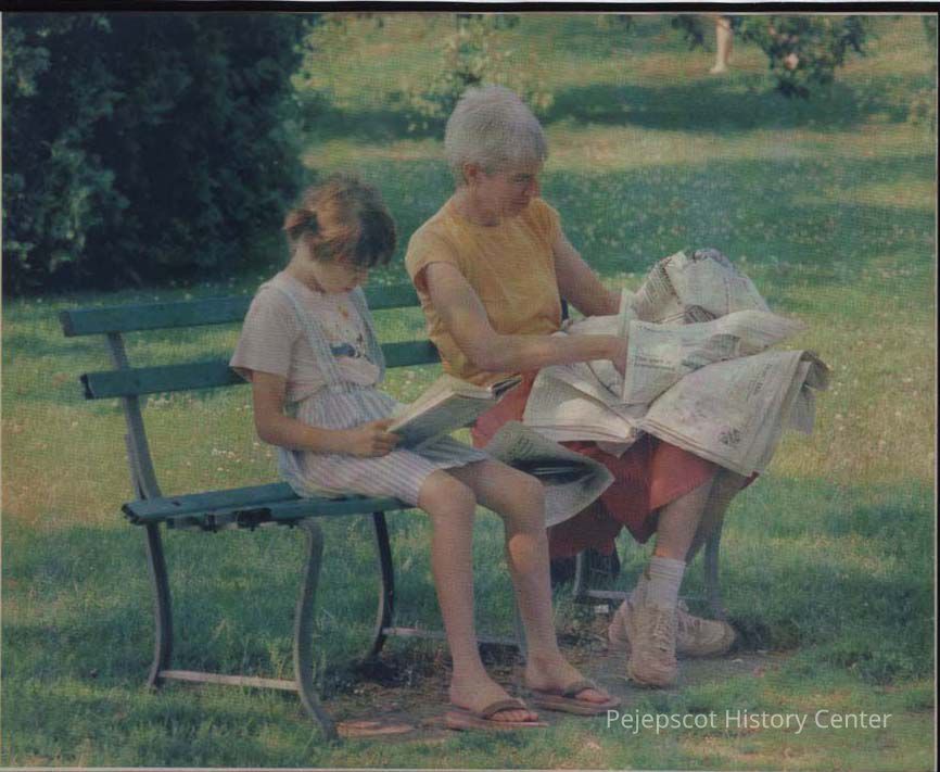 A photo view of 2 people sitting on a bench. 6/29/1988.