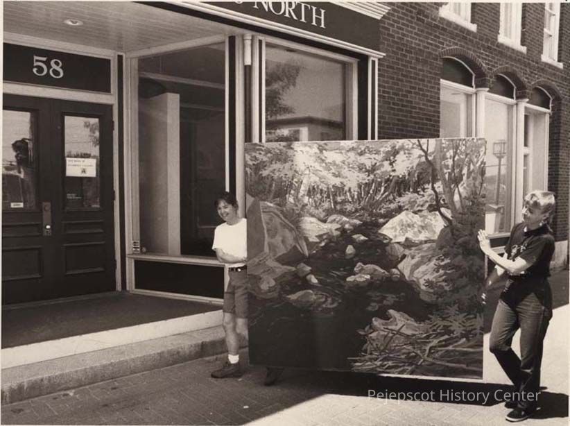 A photo view of 2 women carrying a painting. 6/2/1992.