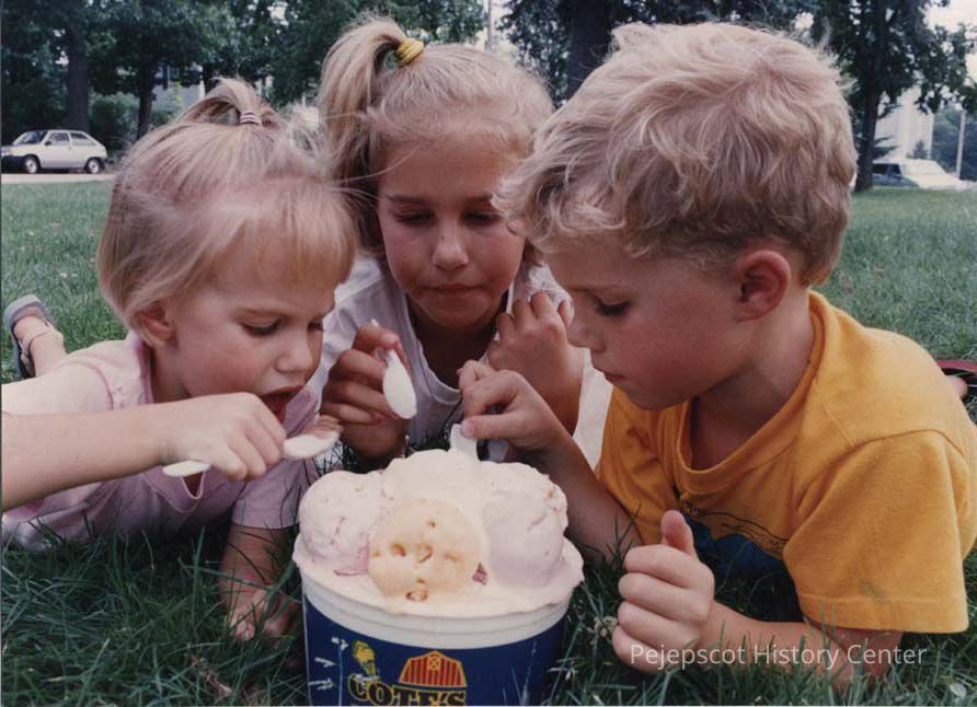 A color photographic view of 3 children eating an ice cream sundae. It is the sundae as in 2003.546c.3634. This photo was published 7/17/1989.