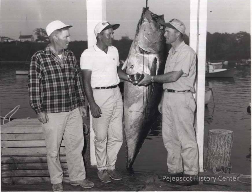 A B/W photographic view of 3 fishermen. They are left to right, Derrill Lamb, Edward Gerry (receiving the award and H. Merrill. The tuna weighed 3,745 pounds. Derrill Lamb caught one that weighed 3,077 pounds. very nearly as big.