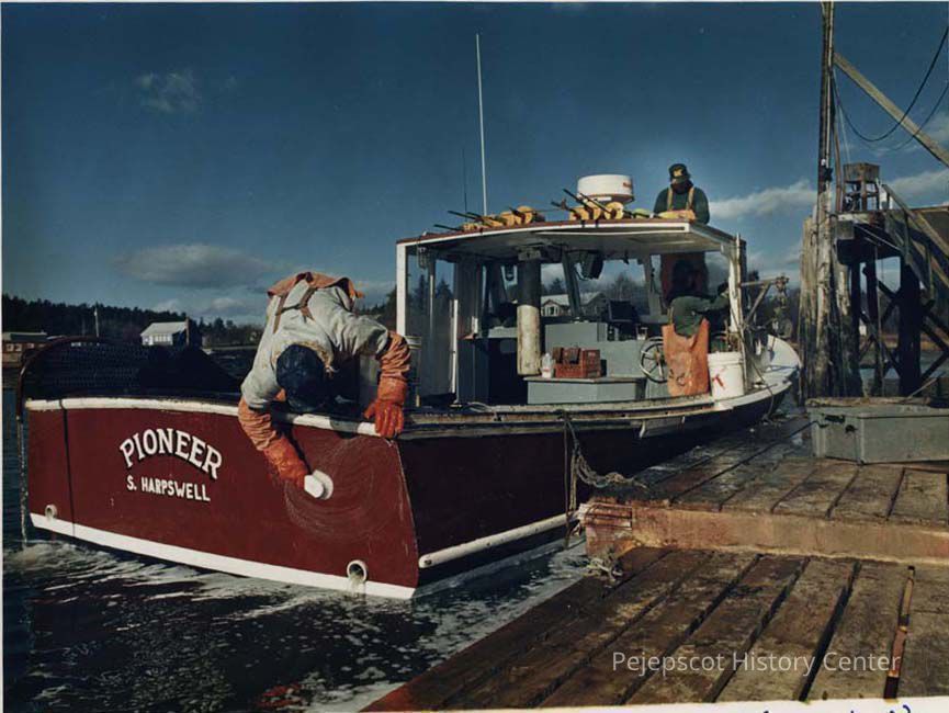 A B/W photographic view of 3 men cleaning their boat at South Harpswell. The men are l to r, Ron Fitzgerald, Roy Knight and Frank Bergeron.