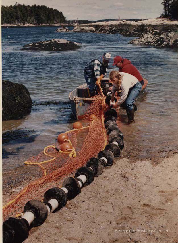 A color photographic view of Eugene Atwood, Mike Wallace and Rick Wallace loading a cod net into a skiff. This photo was published 5/19/1992.