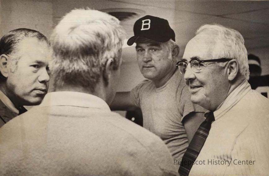 A B/W photographic view of 4 men. They are from the left, Dr. James Fife, Sid Watson, Mike Linkovitch and Dr. Daniel Hanley. This photo was published 10/6/1975.