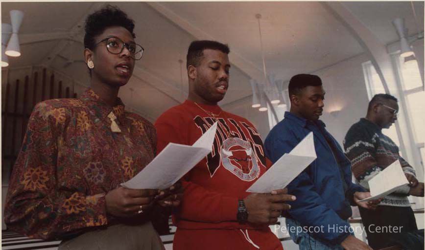 A color photographic view of 4 people singing at Martin Luther King, Jr. Day at BNAS. This photo was published 1/20/1992.