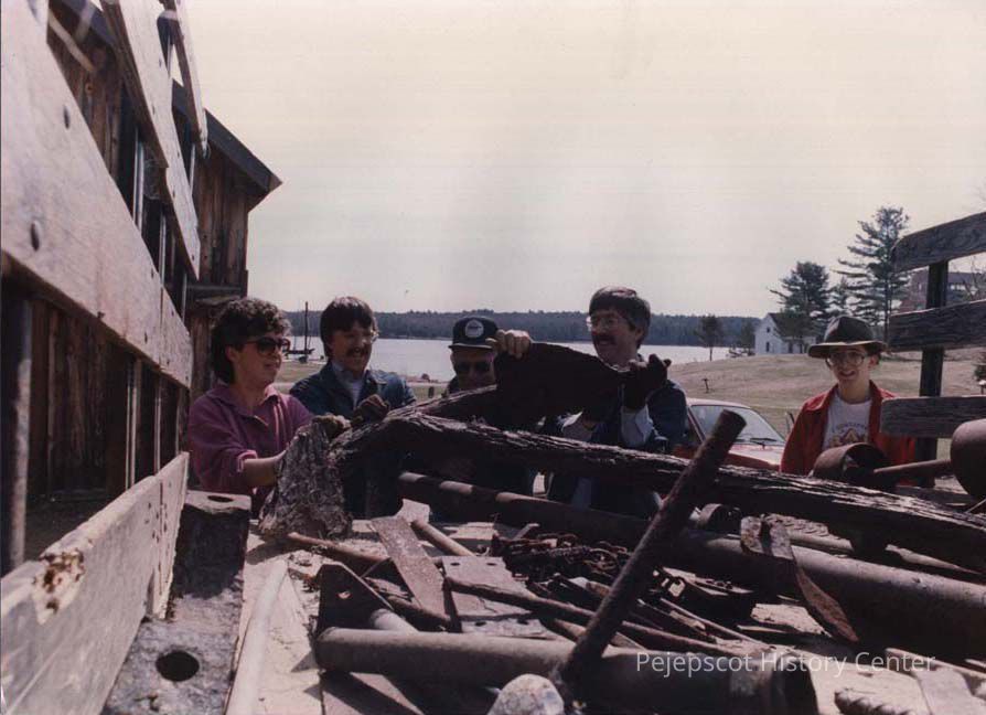 A photo view of 5 people looking at an old anchor. 5/7/1989.