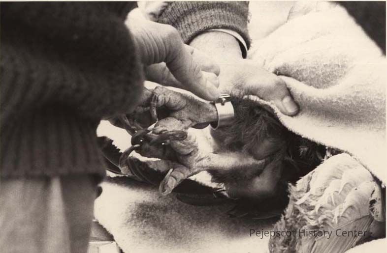 A photo view of a Bald Eagle being banded. 3/6/1992.