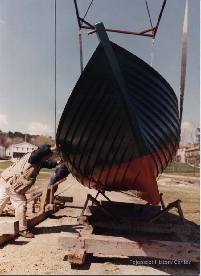 A color photographic view of a boat being lowered into a cradle. Two men are guiding the boat. This photo was published 5/10/1989.