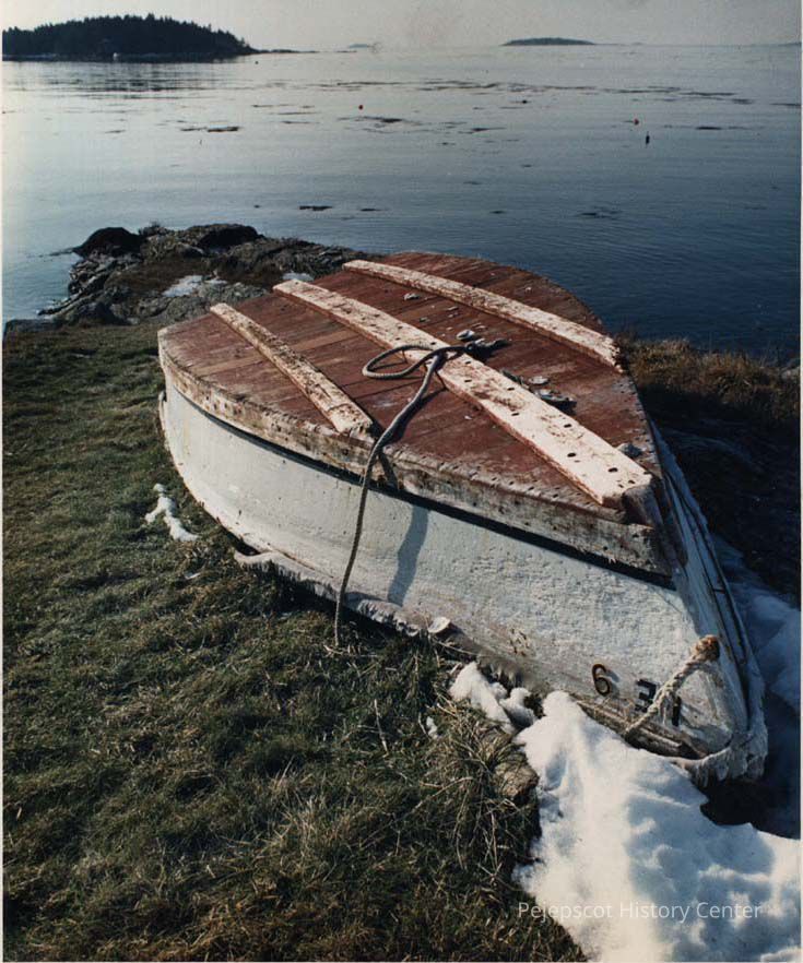 A photo view of a boat lying in the snow. 3/6/1990