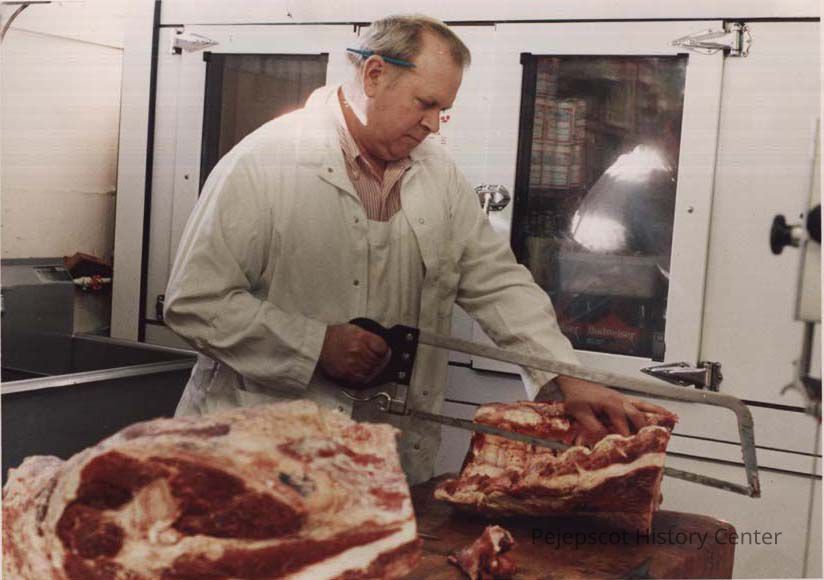 A color photographic view of a butcher at work. This photo was published 2/1/1/1987.