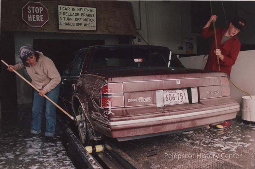 A color photographic view of a car being worked on in a car wash. This photo was published 3/10/1987.