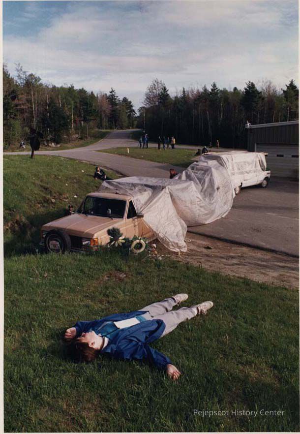 A photo view of a car wreck scene set up for training. 5/5/1990.