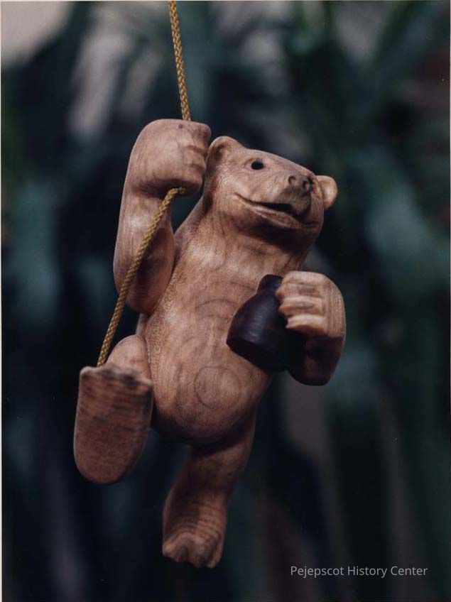 A color photographic view of a carved wooden "Pooh" bear. Christmas decoration? This photo was published 12/13/1991.