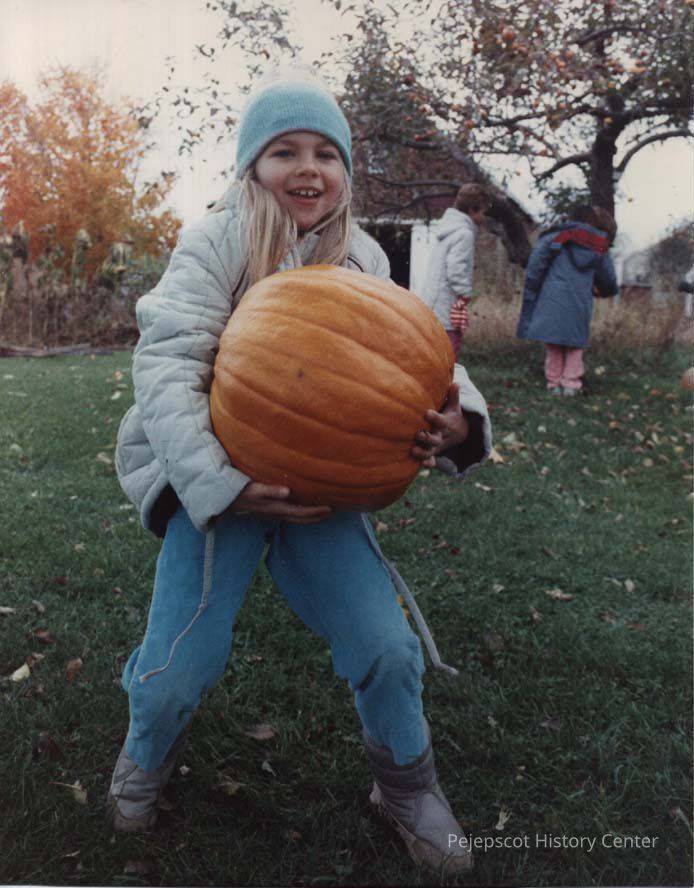 A photo view of a child carrying a pumpkin. 10/23/1989.