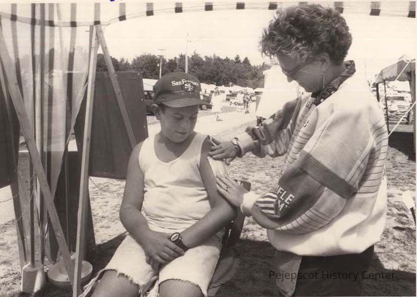 A B/W photographic view of a child getting a patch put on. Marked on the front, "Tops Fair".