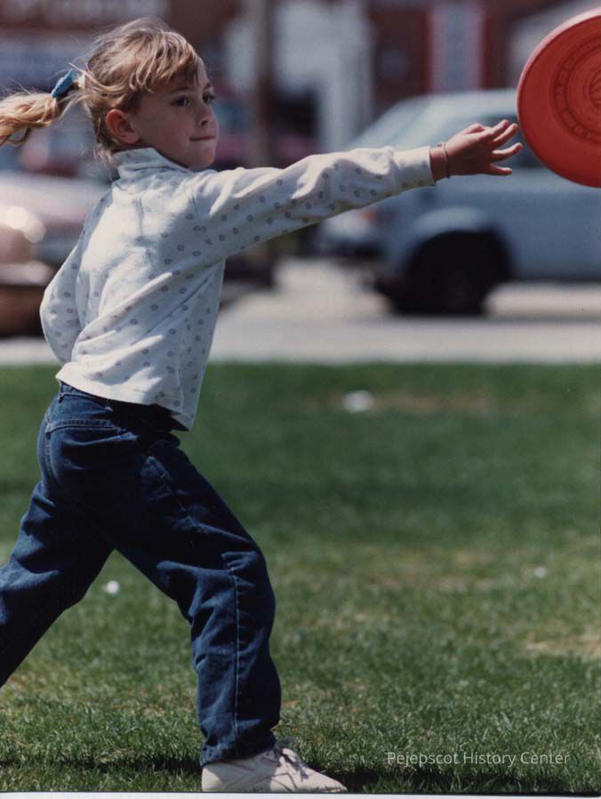 A photo view of a child playing with a frisbee. 5/4/1989.
