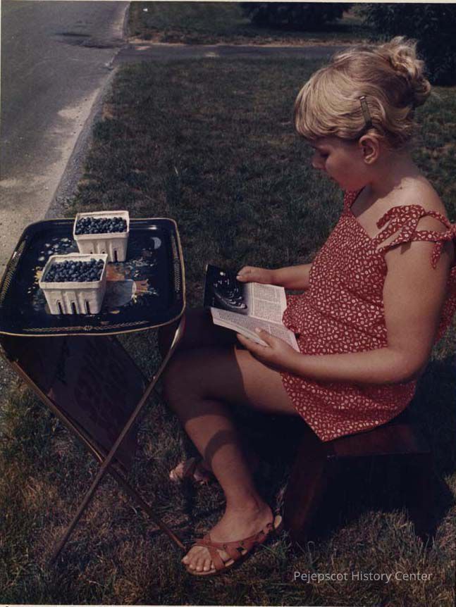 A color photographic view of a child selling blue berries. This photo was published 8/16/1988.