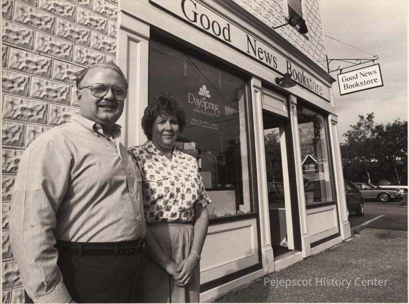 A B/W photographic view of a couple in front of the Good News Bookstore. This photo was published 10/7/1992.